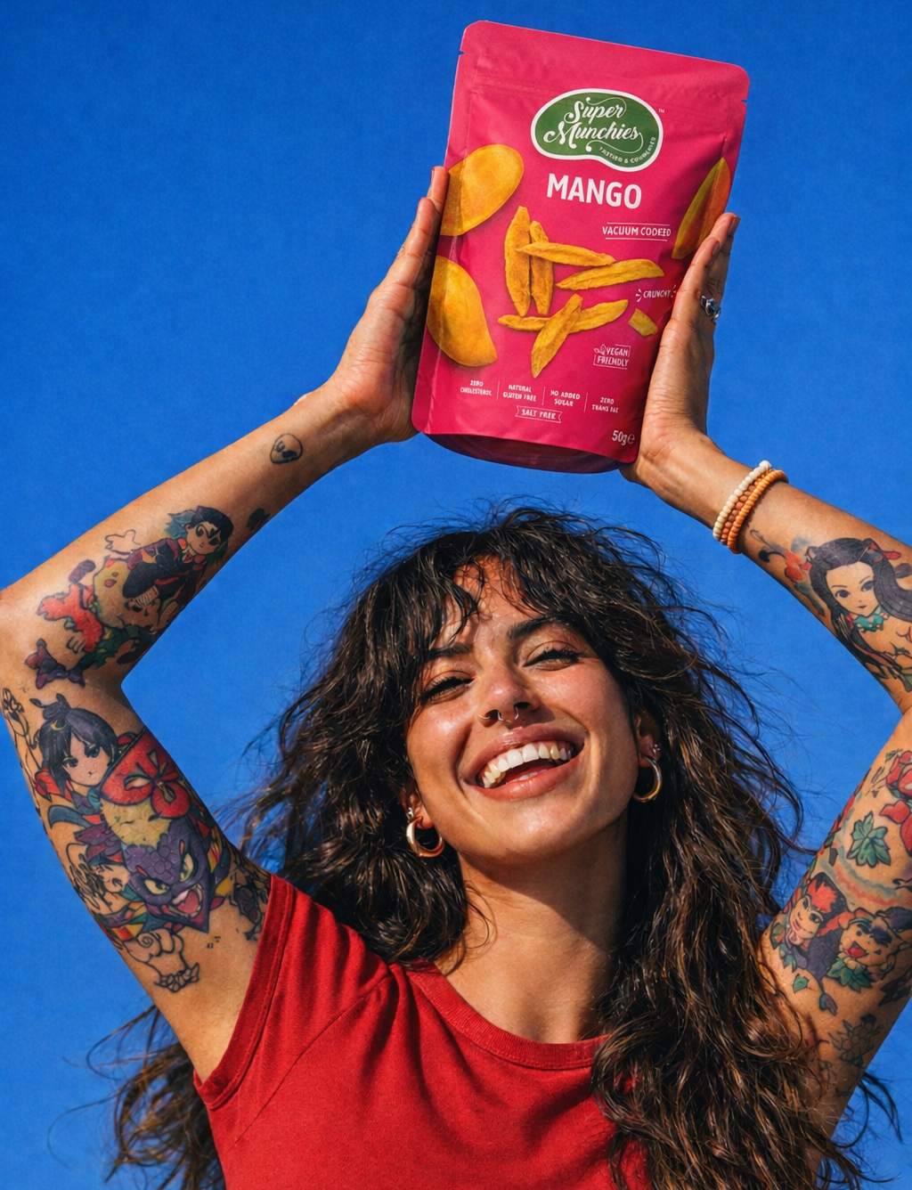 Wir bei Super Munchies bleiben authentisch. Echte Früchte, echtes Gemüse und echte Sorgfalt stehen hinter jedem unserer Produkte. Jeder Schritt wird bewusst gewählt von der sorgfältigen Auswahl frischer Zutaten bis zur schonenden Vakuumgarung, die den natürlichen Geschmack bewahrt. Ohne Konservierungsstoffe. Ohne künstliche Aromen. Ohne Zusätze, die man nicht kennt. Nur ehrliche Snacks mit gutem Gefühl, denen du vertrauen kannst und die du jederzeit genießen kannst ob unterwegs oder in einem Moment ganz für dich.