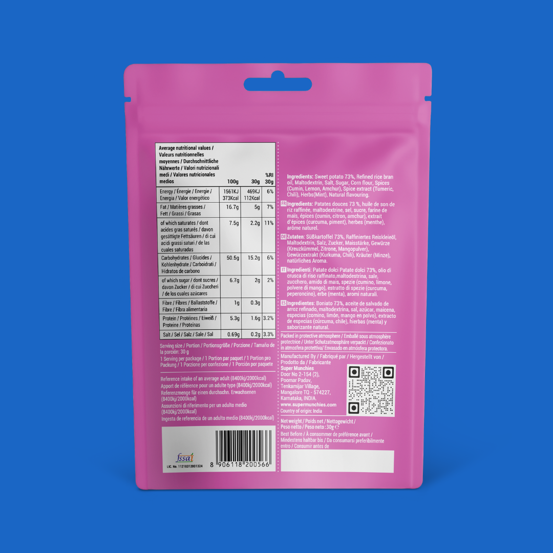 Echte Süßkartoffelchips mit einem Hauch von Schärfe und Frische. Verfeinert mit einer kräftigen Chili-Note und einem Spritzer frischer Minze, bietet dieser Geschmack die perfekte Balance zwischen Würze und Erfrischung. Jeder Bissen ist knusprig, spritzig und einfach ein bisschen überraschend.