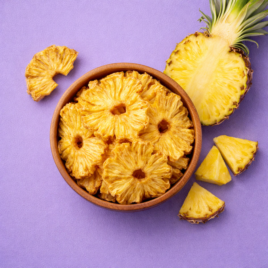 Ananas ist die perfekte Verbindung aus natürlicher Süße und lebendiger Frische. Unter warmem, tropischem Himmel gereift, entwickeln reife Ananas ein saftiges, vielschichtiges Aroma, das zugleich frisch und intensiv ist. Unsere Pineapple Chips bringen genau diesen Kontrast zur Geltung. Jede Scheibe bewahrt die feine, natürliche Säure der Frucht, harmonisch ausbalanciert mit milder Süße und einem klaren, knusprigen Biss.